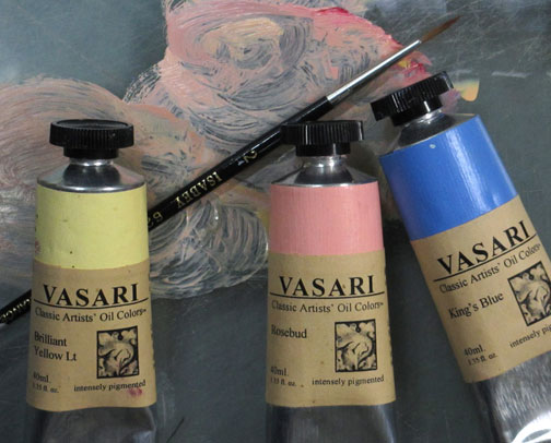 David mostly uses Vasari’s handmade oil paint. If you’ve read my blog you know I’m a big Vasari paint lover, so this one was not new to me but it did give me a chance to try out some new paint colors. I already had the rosebud, and pairing that with the Video blue extra pale and the Brilliant yellow light, gives you a high value balanced triad that works well for portraits. Vasari is creamy without being runny, is very pure and saturated. If you’ve never used this paint think about trying it.